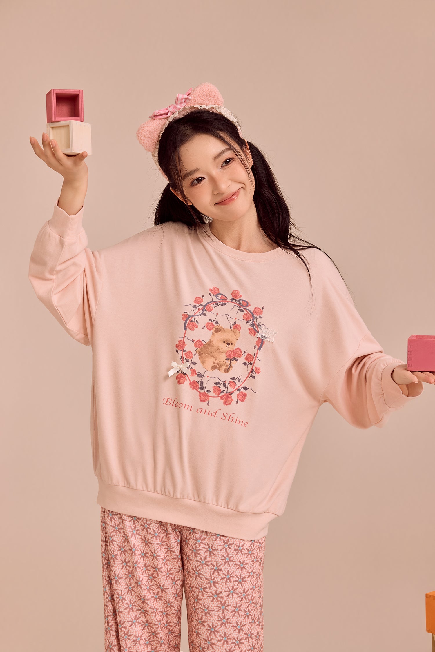Milk tea pink floral teddy bear Pajama set - Relaxed Fit nightwear